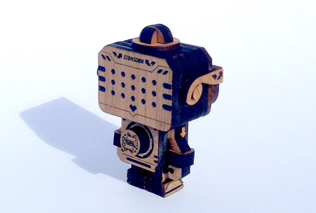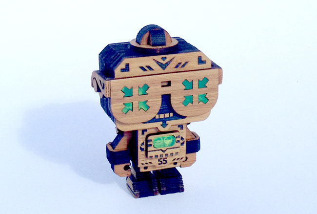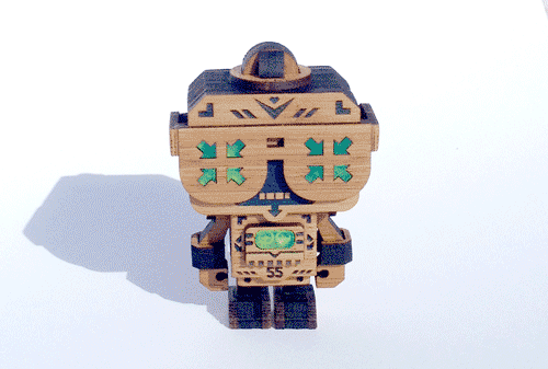 This is one of my bamboo wooden toy project. All the parts were laser cut and engraved. I hand assembled, painted, stained, sanded and finished. I use a little bit of translucent acryl plate for finishing touch as well. It is about 3 inch tall small art toy.