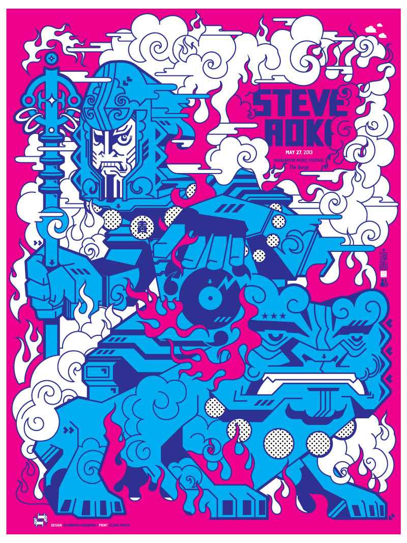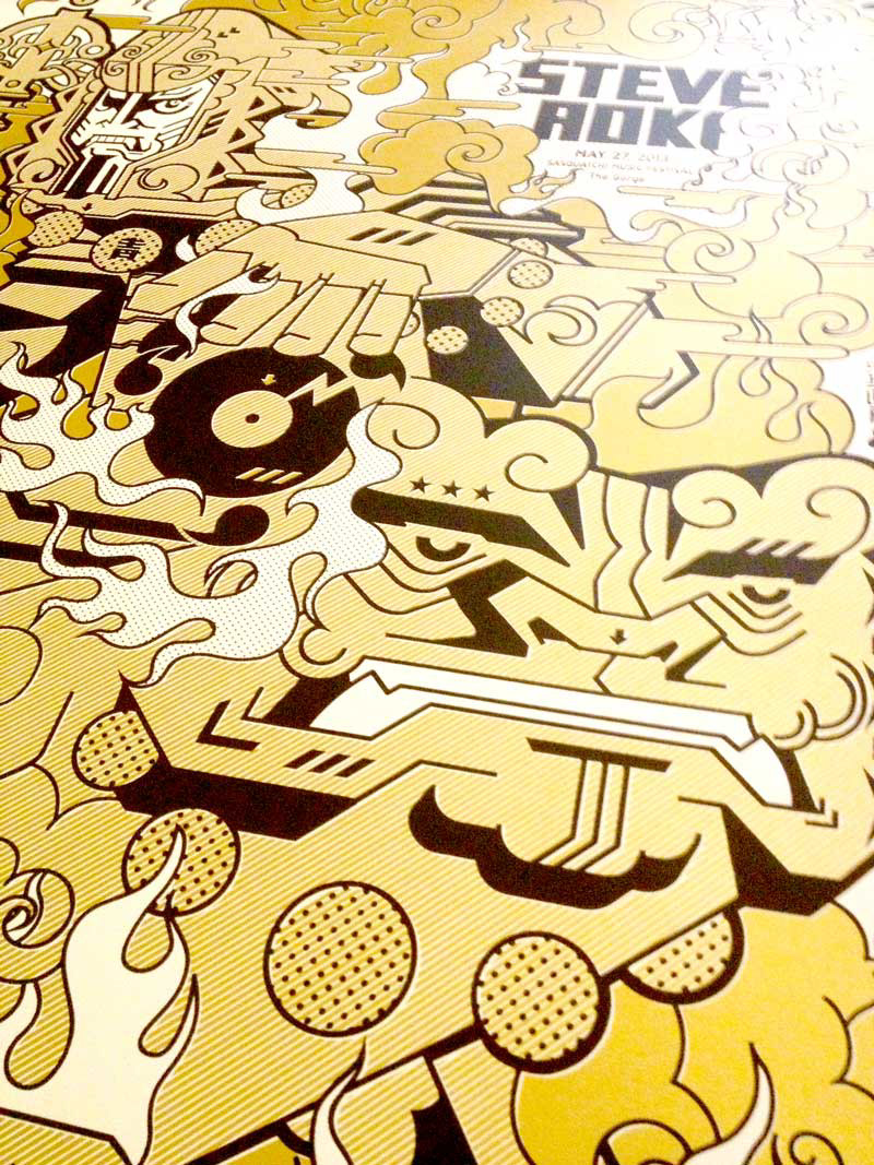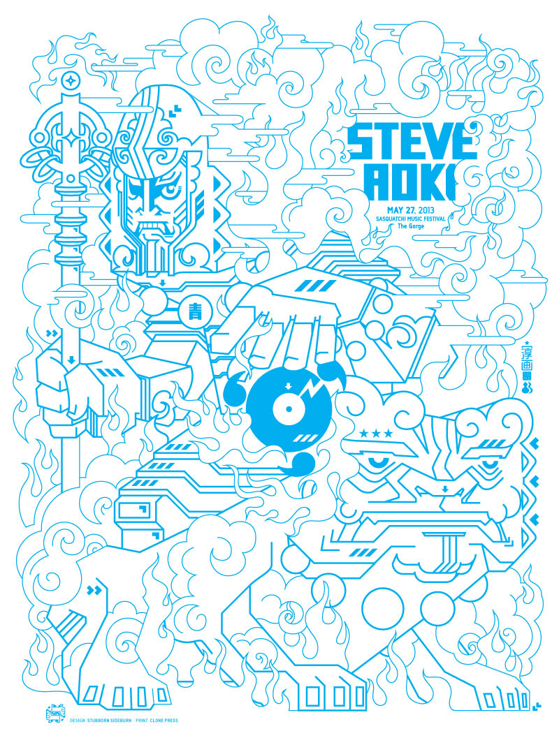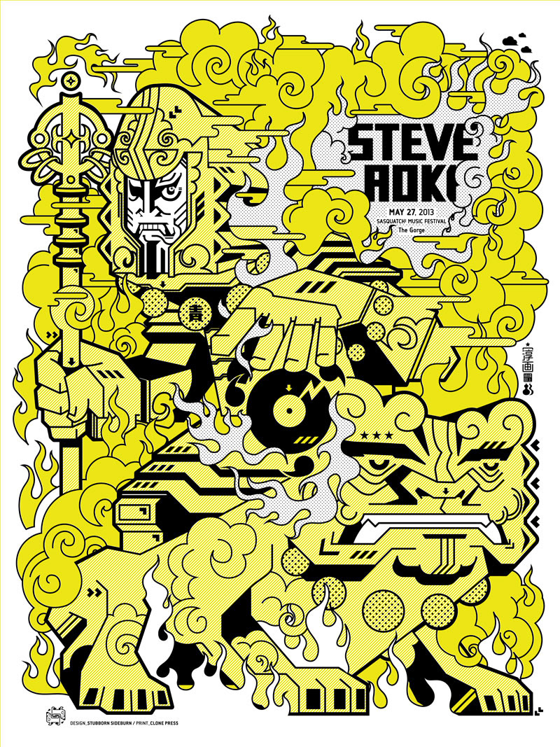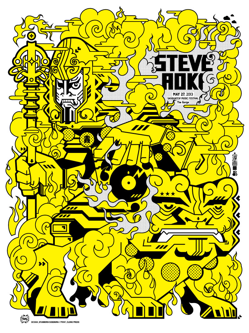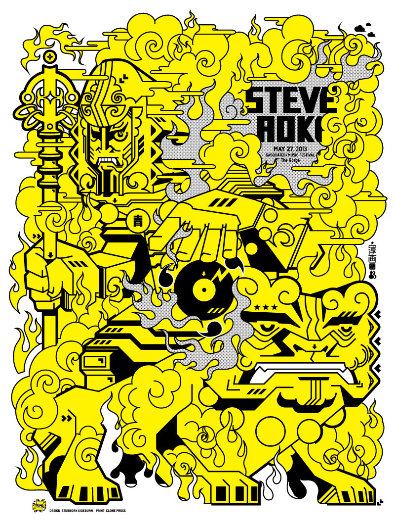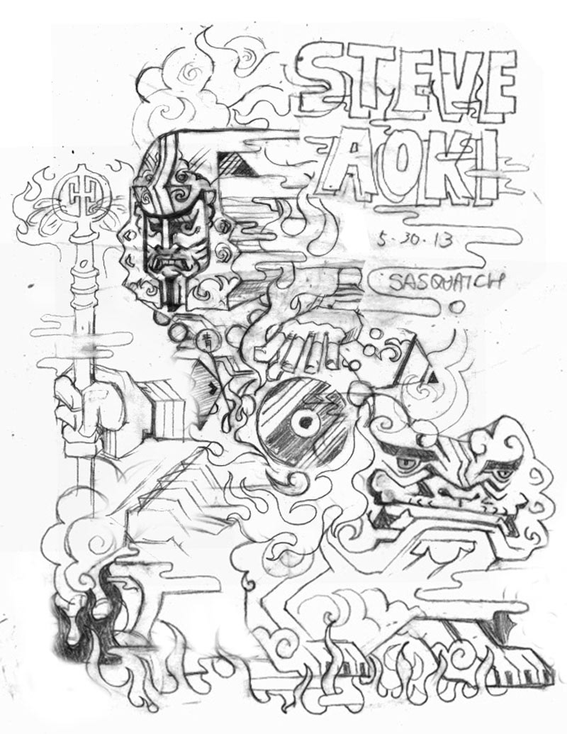 This was really exciting project. I did a poster design/illustration for Steve Aoki's concert at Sasquatch Music Festival. I came up with Japanese influenced almost a modern twist of Ukiyo-e, wood block print because his Japanese heritage and an agressive image to capture his music. Some of the giometric shape also matches his electro sound feel. The poster will be printed in 2 color screen print with black and gold ink.