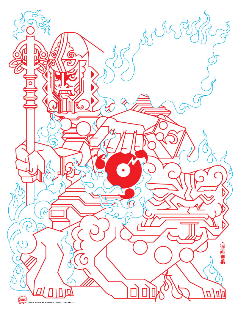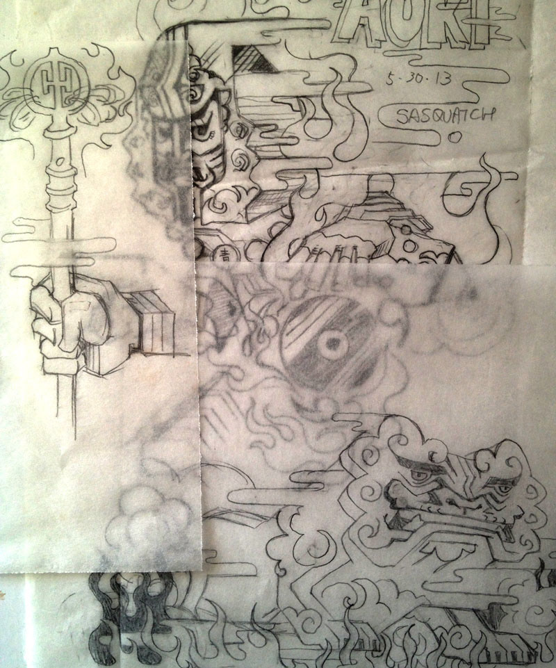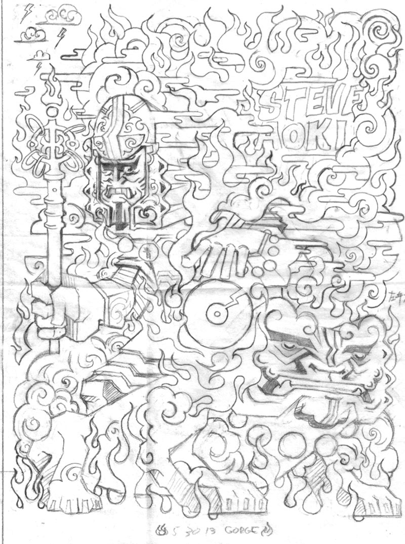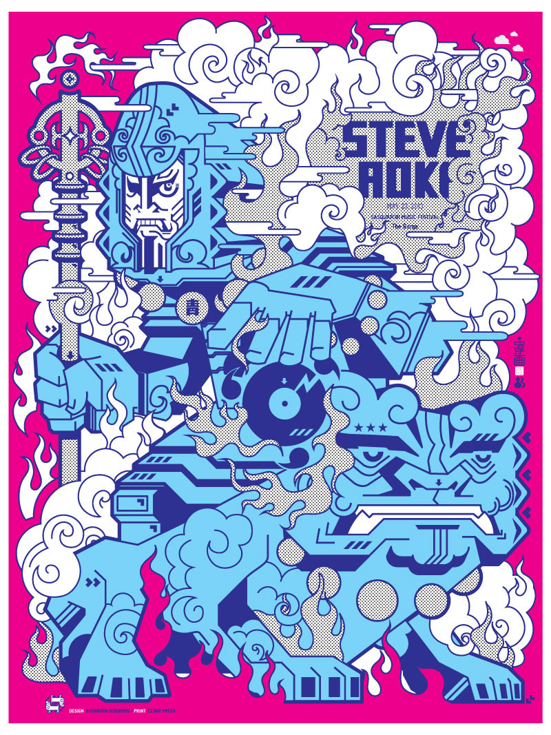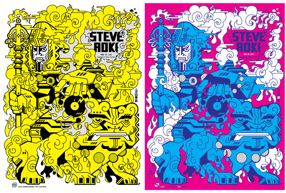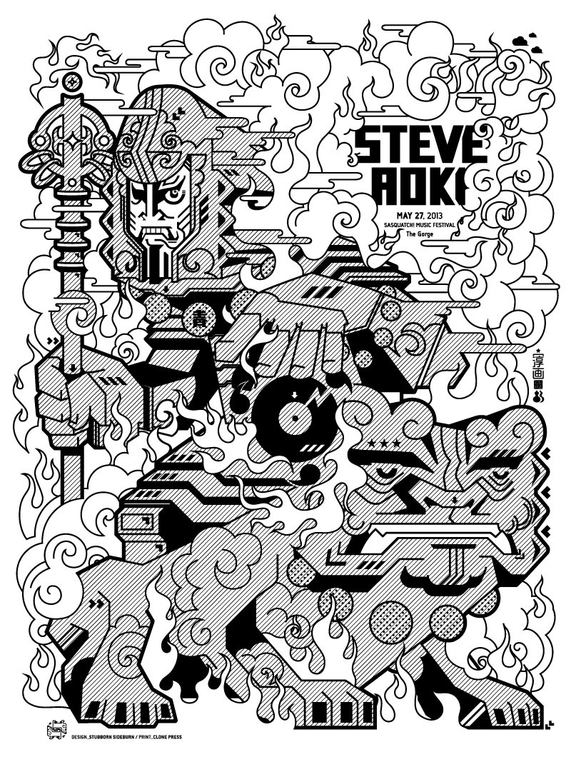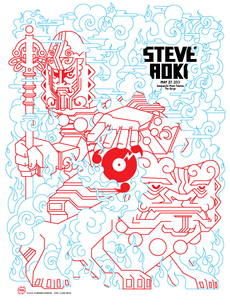 This was really exciting project. I did a poster design/illustration for Steve Aoki's concert at Sasquatch Music Festival. I came up with Japanese influenced almost a modern twist of Ukiyo-e, wood block print because his Japanese heritage and an agressive image to capture his music. Some of the giometric shape also matches his electro sound feel. The poster will be printed in 2 color screen print with black and gold ink.
